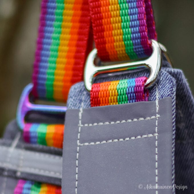 Pannan remmiosa on kevyttä sateenkaariraidallista polypropeeninauhaa, jonka murtolujuus on n. 250 kg. Metalliosien tiedot löydät kohdasta Materiaalit.