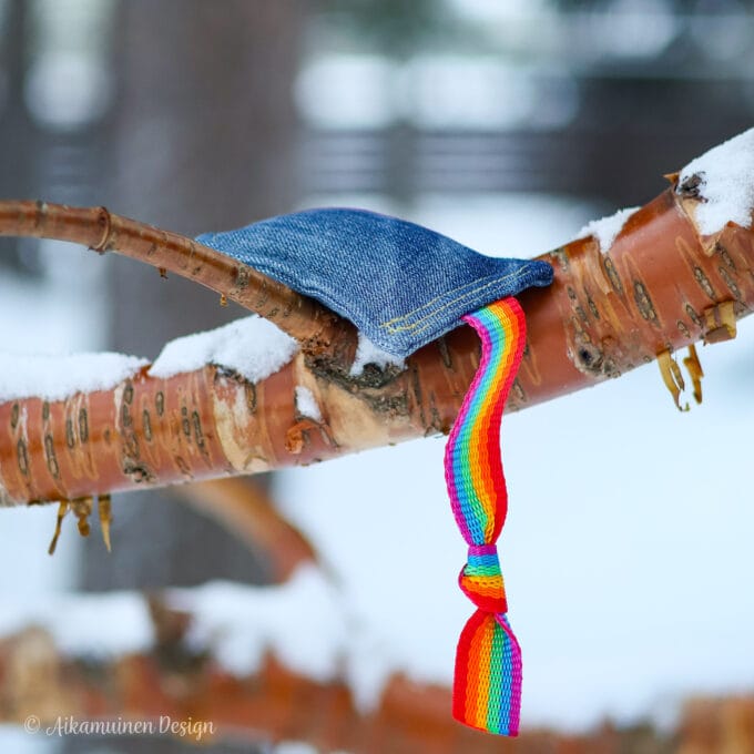 Tyynyn koko ja muoto voi hieman vaihdella, sillä niihin hyödynnetään farkun jämäpaloja.